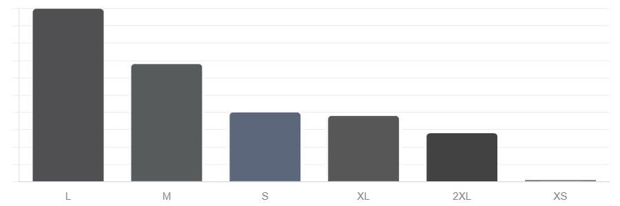 La distribución histórica global dibuja una curva pronunciada: L lidera con claridad, seguida de M, luego S y XL casi empatadas, y finalmente 2XL con un peso notable. La XS prácticamente no existe.